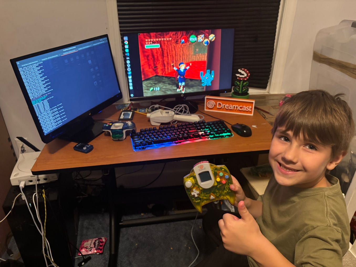 Meet my son, who was the first kid to ever play Mario 64, Doom 64, Mario Kart 64, Starfox 64, Sonic Mania, Grand Theft Auto 3 and Vice City, and now The Legend of Zelda: Ocarina of Time—some of my all-time favorite games from childhood—on my favorite console, the Sega Dreamcast, for his first play-throughs… and his little sister plays with us as well…